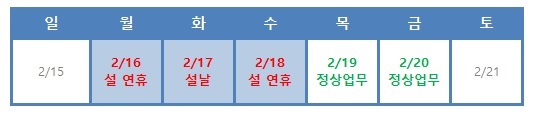 휴무 일시 : 2026년 2월 16일(월) ~ 2월 18일(수)